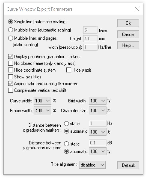 Aspect ratio and scaling like screen: The aspect ratio and the distribution of graduation markers of the exported graph will be the same as in the screen display. If this option is not checked, the aspect ratio and the distribution of graduation markers are adapted to the paper format in order to fill the entire page. This option will only be applied, if the Single line option is activated.