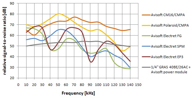 Relative signal-to-noise ratios of different microphones (sound source located exactly on-axis). Note that the s/n ratio will be degraded if the sound source is located off-axis. The off-axis attenuation will depend on the physical size of the diaphragm and the signal frequency. So, the largest model Avisoft CM24/CMPA is the most directional one.
