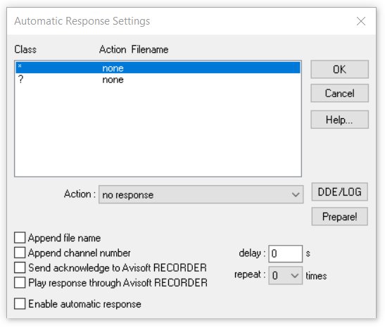 The listbox on the top of the dialog box lists all available classes. Additionally, there are entries for unrecognized elements ? and wildcard * responses. To specify the response for a class, select the corresponding line on the list and select the type of action from the Action listbox. If the action specified for the wildcard * class is not no response, this action will override any other actions specified on the other classes. Some actions require to input a filename or another text string as a parameter.