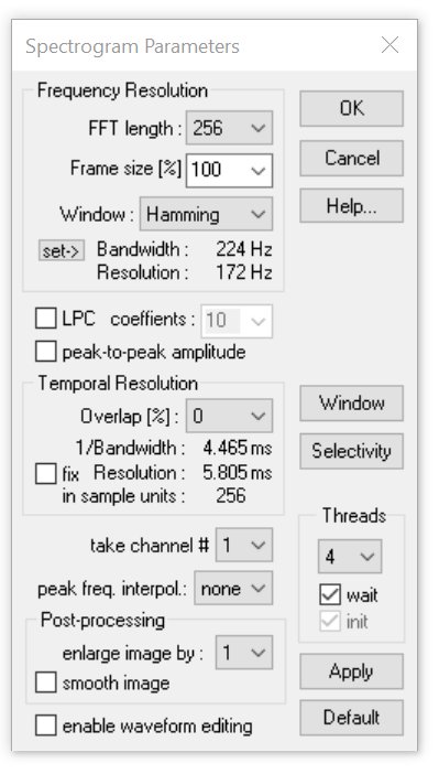 wait If more than one thread has been selected and this option is not activated, the spectrogram window will be launched before the spectrogram has been completed, which can accelerate the workflow. However, this may also lead to problems in conjunction with the Automatic Parameter Measurements tool.