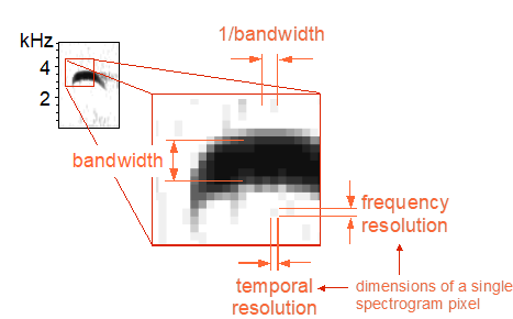 The spectrogram parameters determine the resolution of the spectrogram along the time and frequency axis. The frequency resolution (corresponding to the filter bandwidth of analog spectrographs) is determined by the sampling frequency, the FFT length, the frame size and the window type. The bandwidth of a spectrogram should be adapted to the signals to be analyzed. The inverse of the bandwidth determines the temporal resolution of the spectrogram.